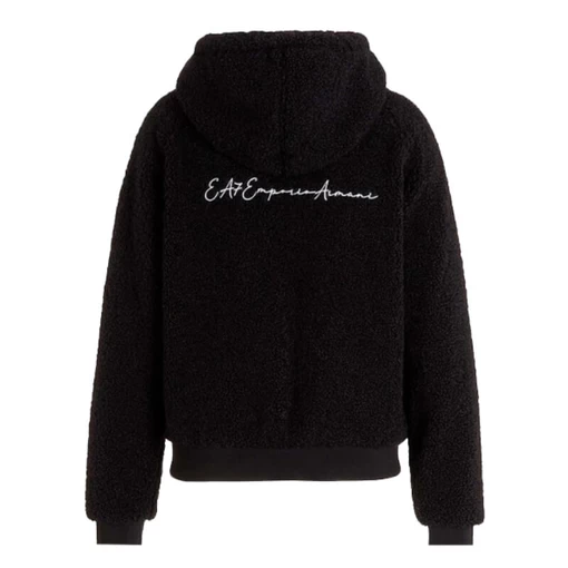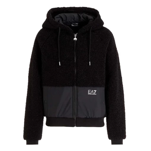 Женская спортивная куртка коллекции Emporio Armani EA 7 черного цвета теплая и комфортная в сезон осень-зима. Модель застёгивается на молнию, имеет капюшонон на шнурке и карманы спереди. Акцент данной вещи, логотип бренда белого цвета на спине,и спереди над карманом. Состав : 100% Полиестер Произведено: Китай