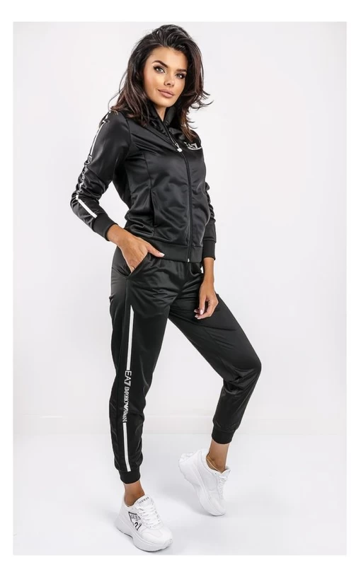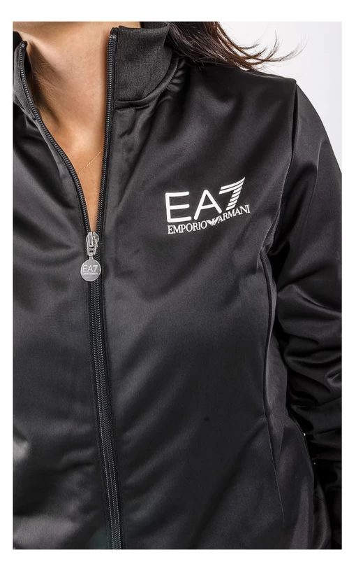 Спортивный костюм EA7 Emporio Armani Tuta Full Zip прекрасное дополнение в гардеробе женщин.В него входит кофта зауженного кроя и зауженные брюки,на резинке.Воротник стойка. Спереди нанесен фирменный логотип на груди,и на левой штанине брюк,в зоне бедра.Для пошива используется качественный материал,состоящий из 100% полиэстера. ЦВЕТ: черный. ТКАНЬ: тонкая; скользкая. ДРУГОЕ: брюки и кофта с карманами по бокам, отделаны резинкой. ЗАСТЕЖКА: рант; замок. УКРАШЕНИЯ: фирменный принт. СОСТАВ: 100% полиэстер.