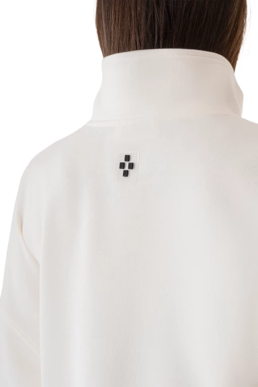 Элегантный свитшот на молнии до середины груди. Объемный крой, длинные рукава и воротник-стойка. Спереди расположен большой карман кенгуру. Манжеты и нижний край выполнены из эластичной трикотажной резинки. Свитшот украшен декоративными строчками-полосками и брендовым патчем-логотипом на спине.