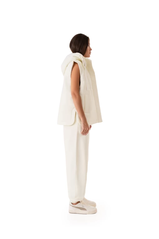 Утепленный жилет свободного кроя. Объемный капюшон на шнурках, застежка на молнию с планкой на кнопках. Имеет два вертикальных кармана спереди. Наружный слой выполнен из плотной тринитки, утепленной микрофлисом, внутри — подкладка из плащевки и утеплитель.