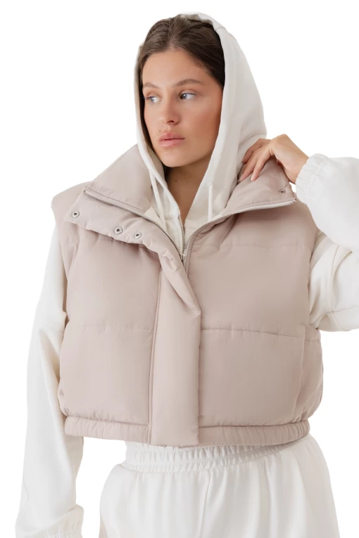 Укороченный жилет с объемным воротником-стойкой и застежкой на молнию и кнопки. Два функциональных кармана, низ слегка собран на резинку. Матовая поверхность, синтетический наполнитель.
