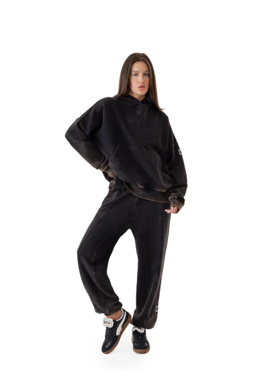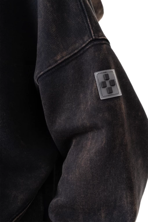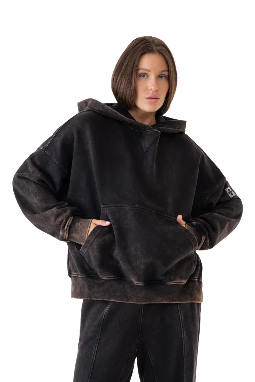 Класичне худі вільного крою з вивареної щільної бавовни. Об'ємний капюшон, велика кишеня кенгуру еластична трикотажна резинка з нижнього краю виробу. Худі оздоблено брендовим патчем-логотипом на рукаві та декоративними перехресними лініями під коміром.